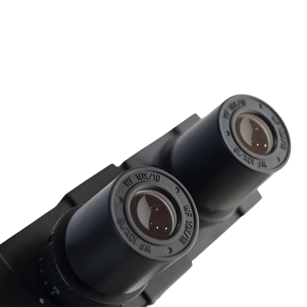 Cabeza binocular tipo sliding, inclinación ergonómica de 45° y rotación 360°, montado sobre un cuerpo estable, que garantiza estabilidad y durabilidad incluso en usos intensivos.
