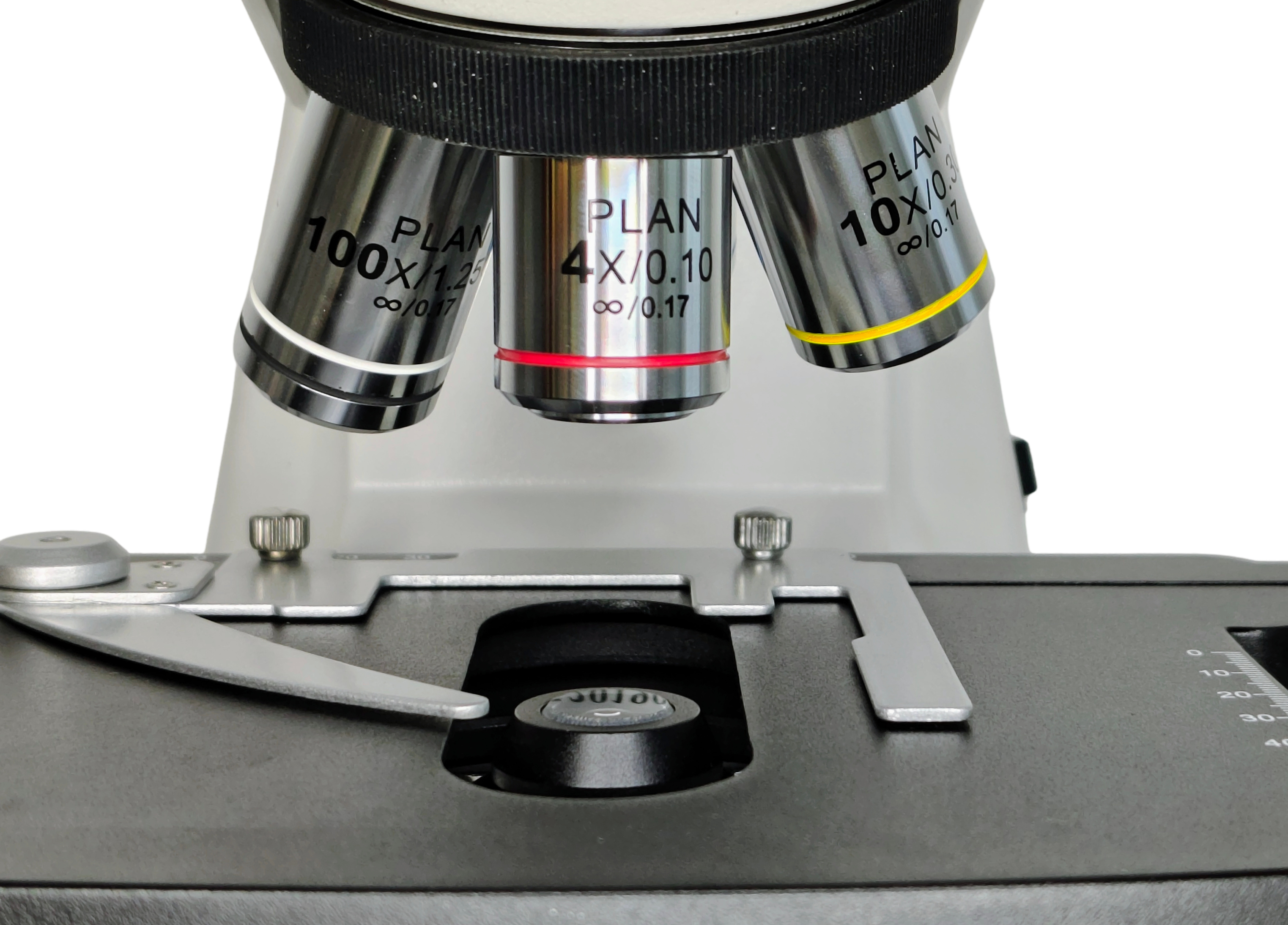 Objetivos planos corregidos a infinito 4x/N.A. 0.1, 10x/N.A. 0.25, 40x/N.A. 0.65 retráctil y 100x/N.A. 1.25 retráctil e inmersión.