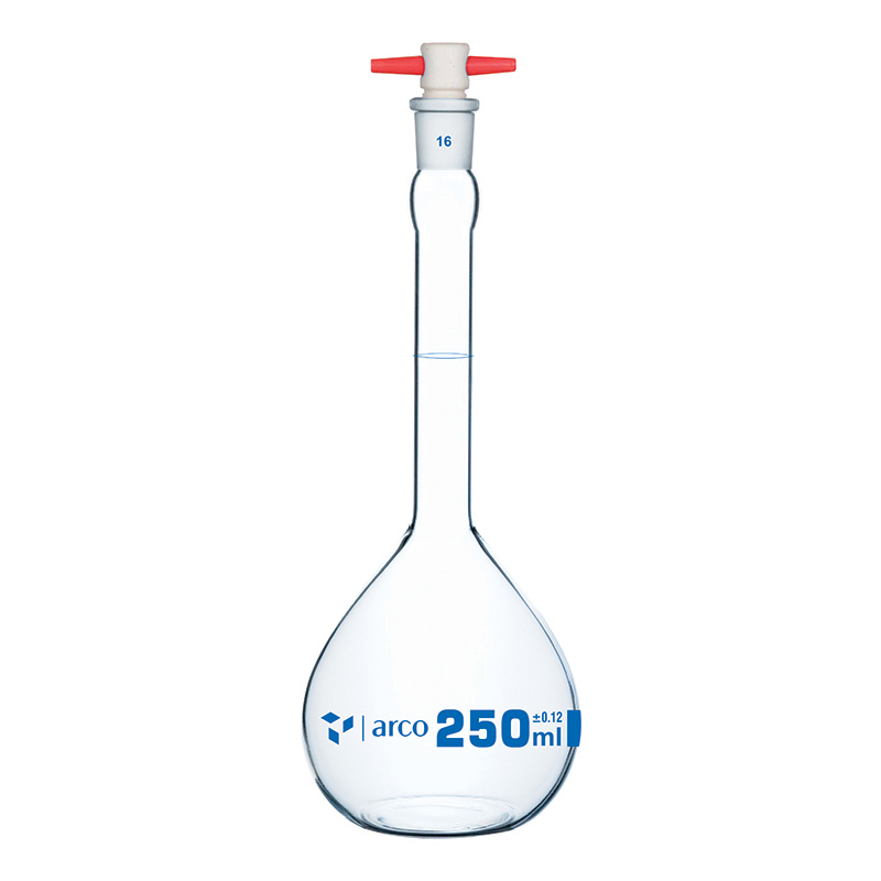 Matraz volumétrico aforado "ARCO" boro 3.3 250ml, incoloro tapón ptfe, clase A con certificado de lote